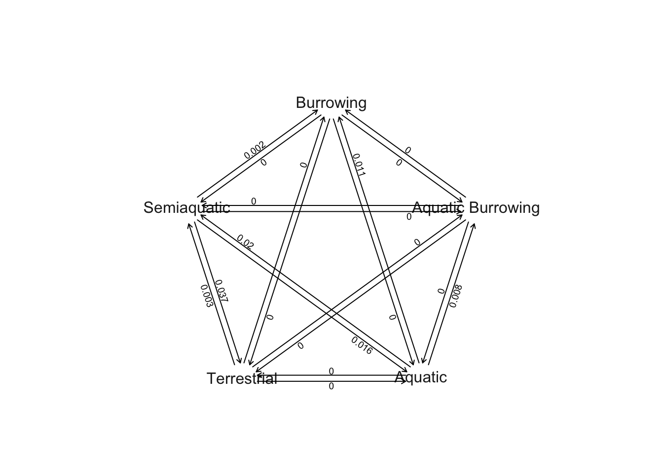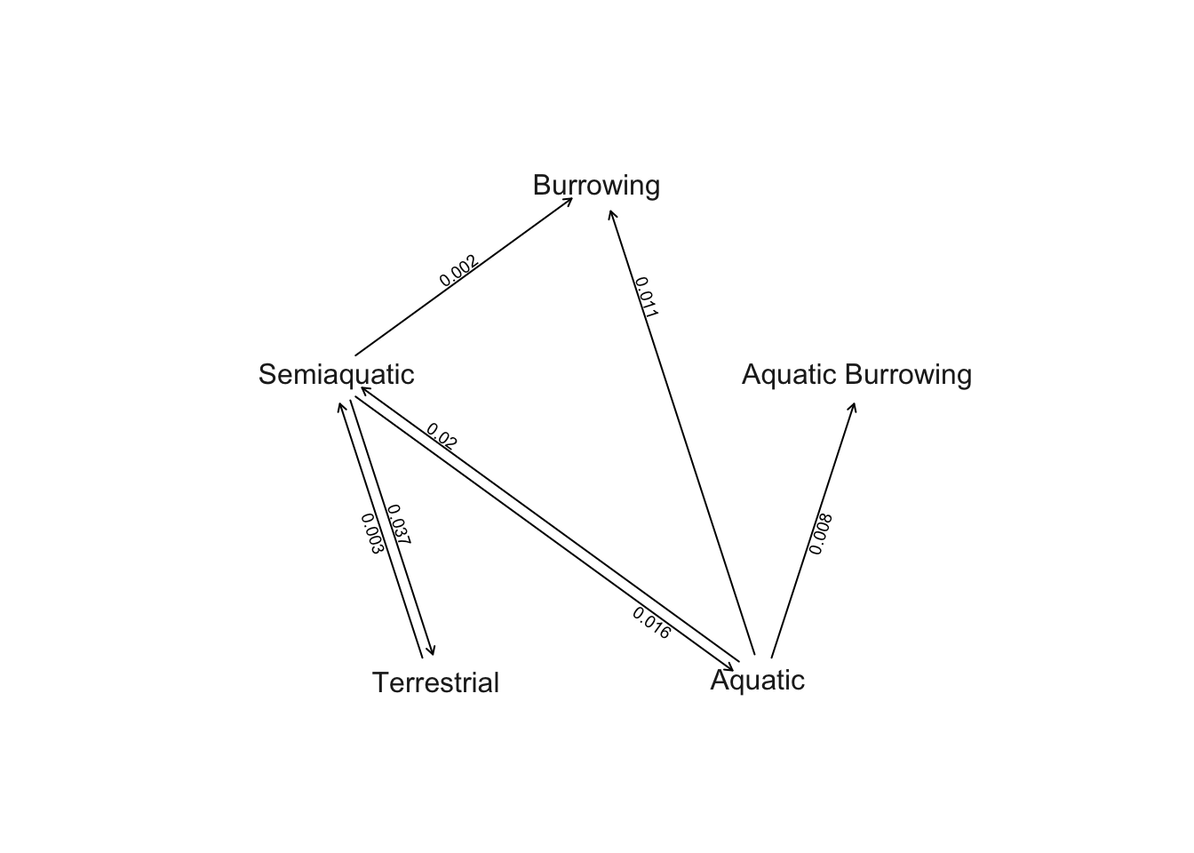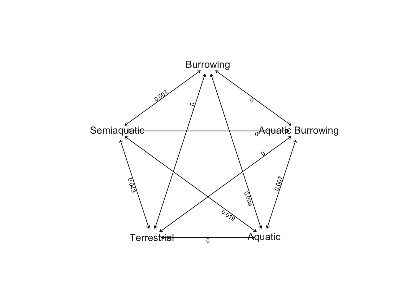 The transition rate between Semi-aquatic and Terrestrial is highest (0.043), followed by transitions between Semi-aquatic and Aquatic (0.019). Burrowing and Aquatic (0.009) and Aquatic Burrowing and Aquatic (0.007) have the next highest rates, followed by Burrowing and Semi-aquatic (0.003). All the other rates are < 0.001 so they appear as zeros on this plot