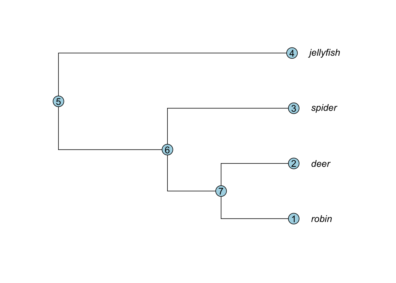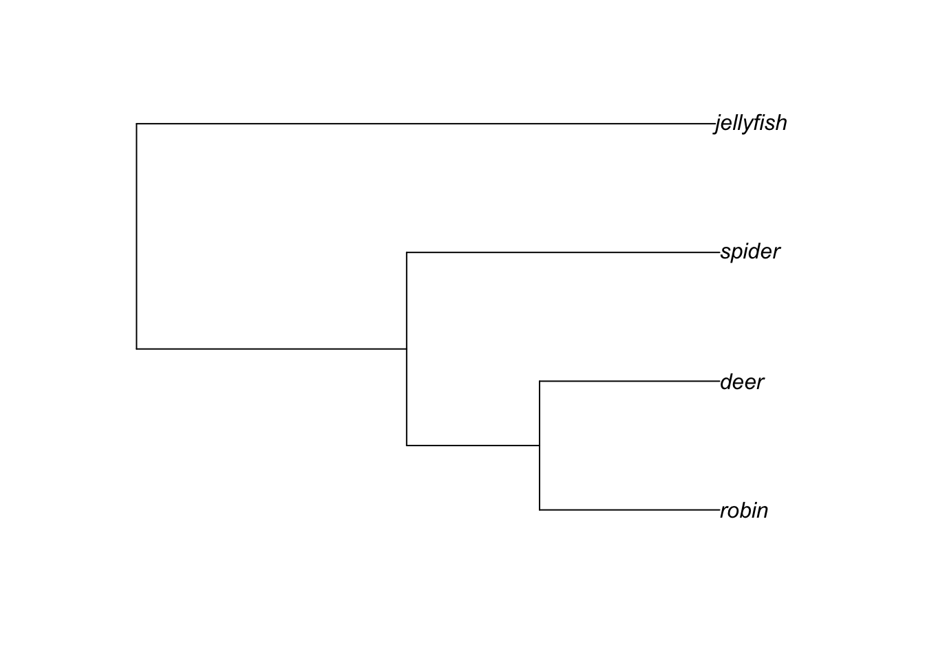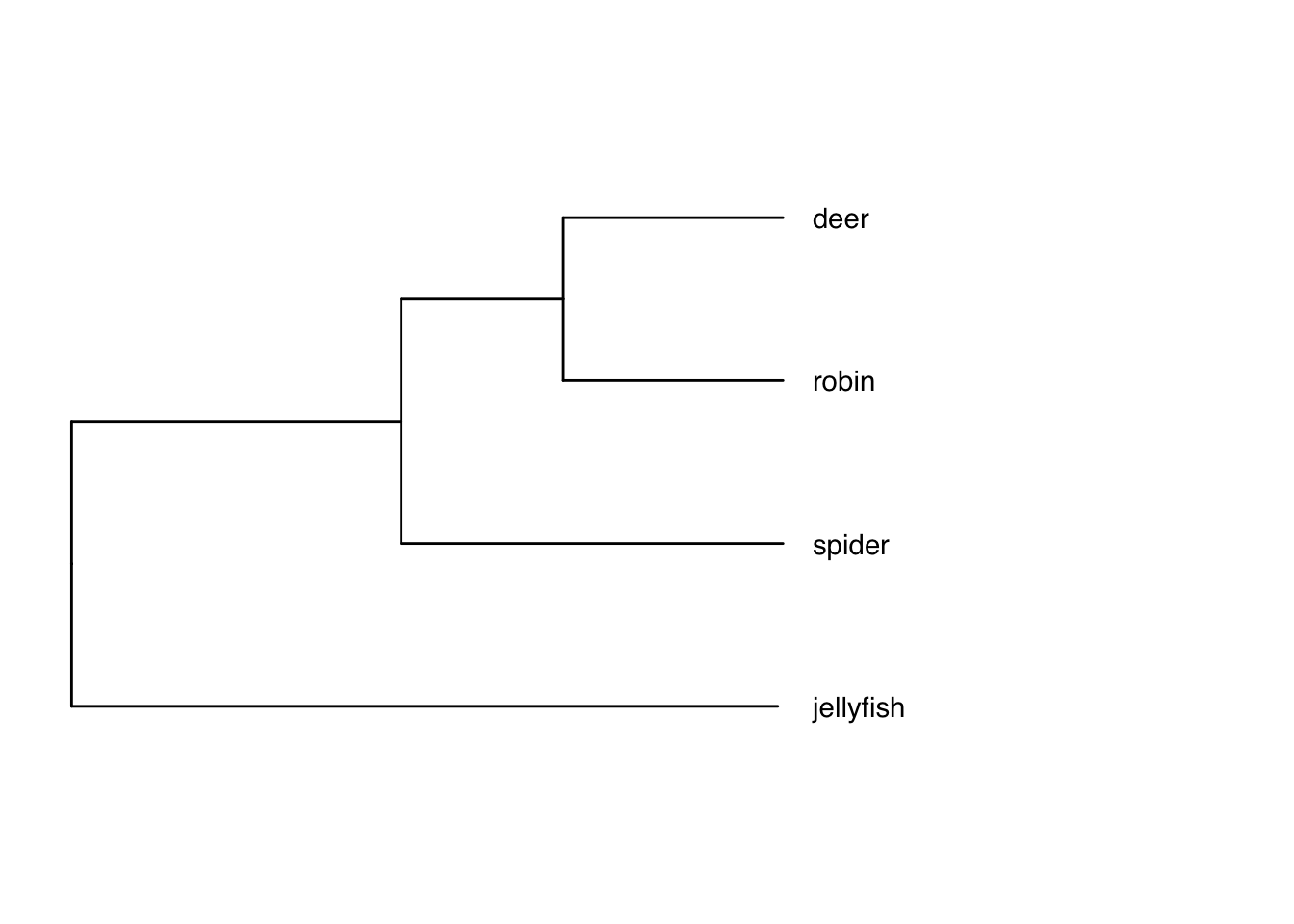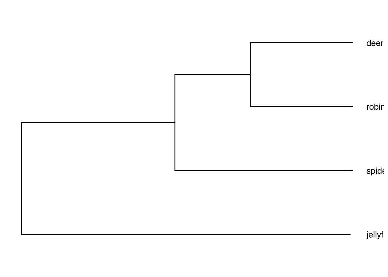 ## $ tip.label : chr [1:4] "robin" "deer" "spider" "jellyfish"