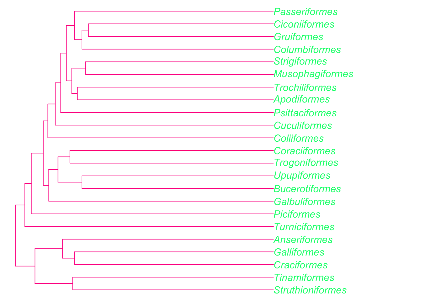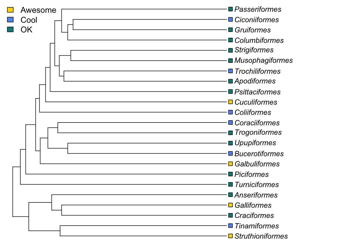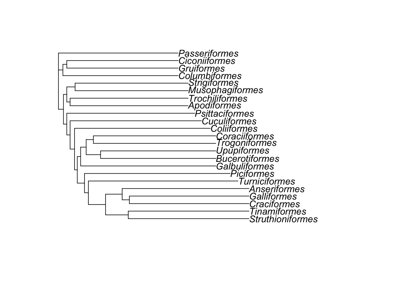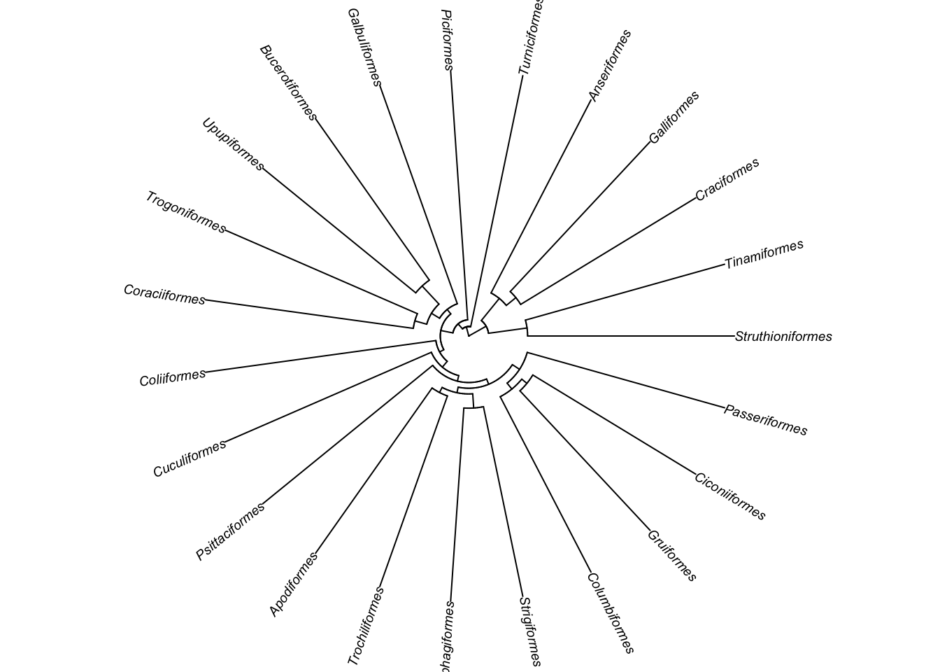 Our tree is rooted but if you wanted to change the root, or root an unrooted tree use root. We can make a new tree and root it on something silly (e.g. Passeriformes) to demonstrate. Remember that your root should be the outgroup from the phylogenetic inference. Rooting a tree incorrectly can cause big issues with downstream analyses, so make sure you choose carefully.