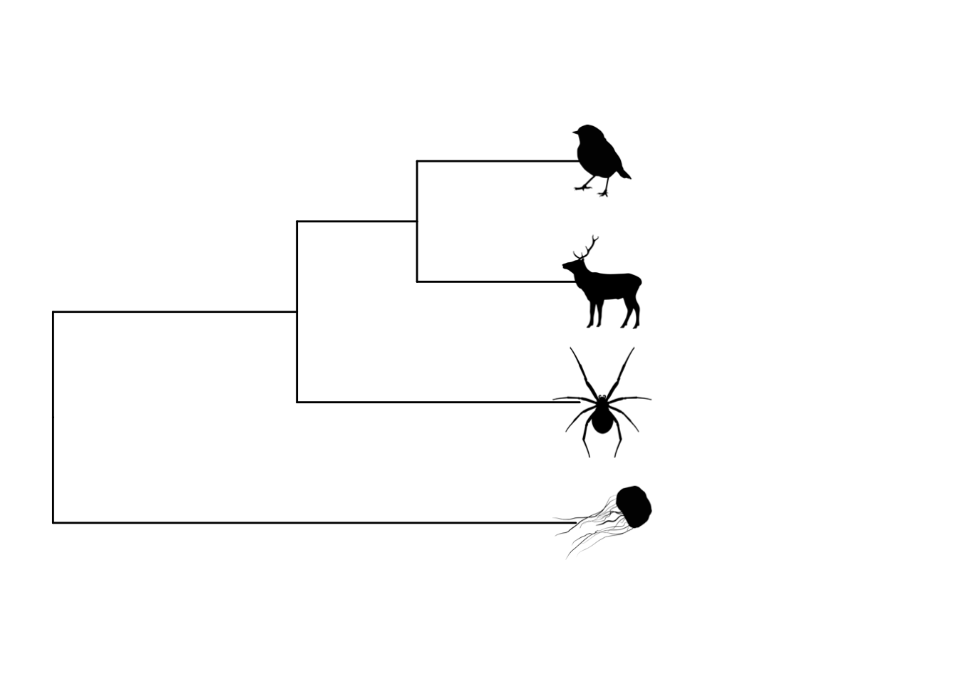 (((robin:4.2,deer:4.2):3.1,spider:7.3):6.3,jellyfish:13.5);