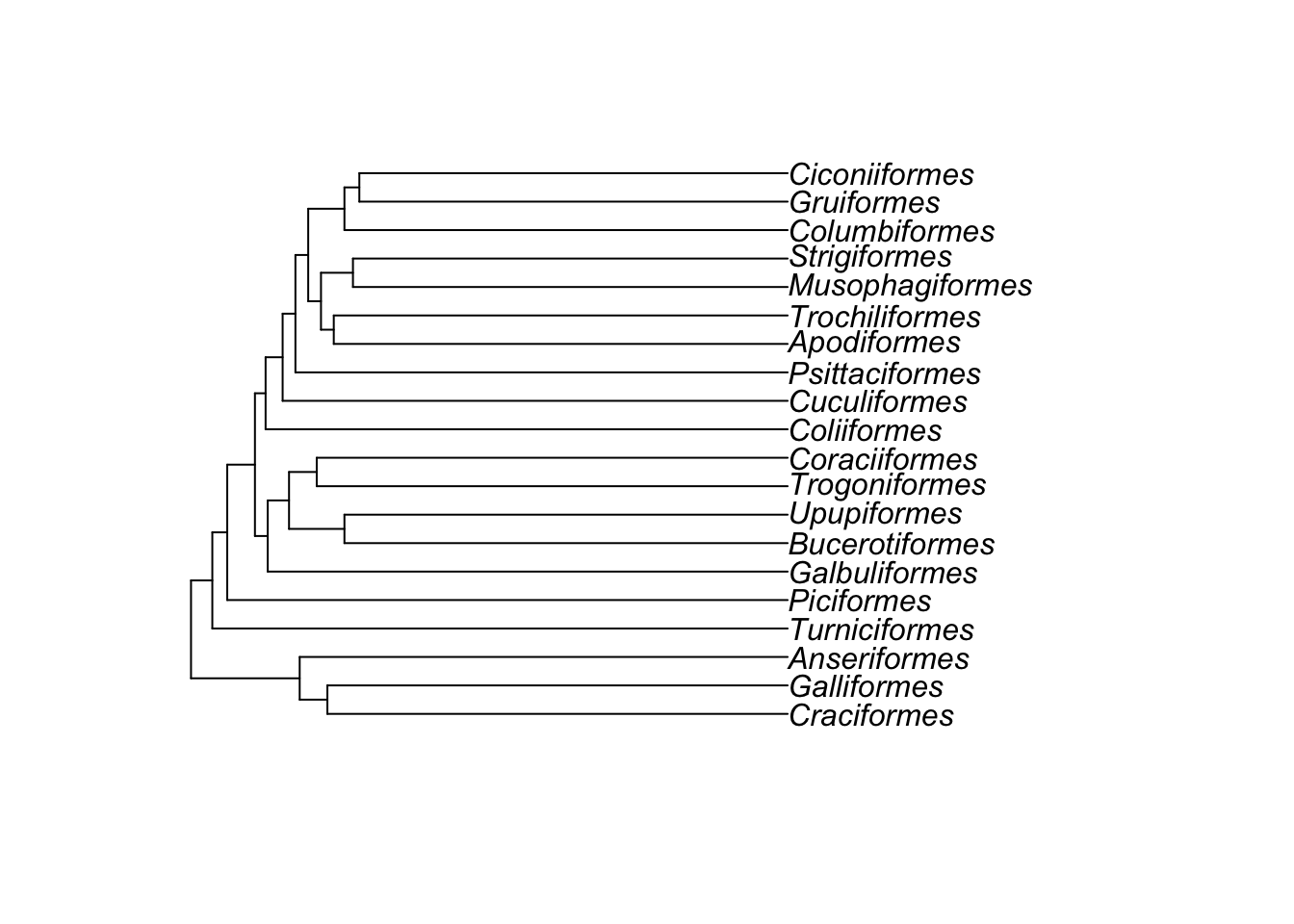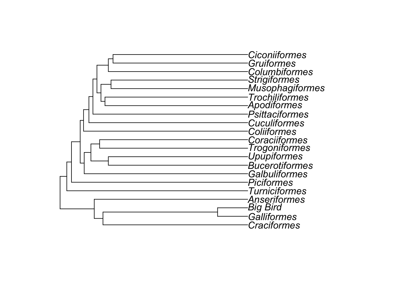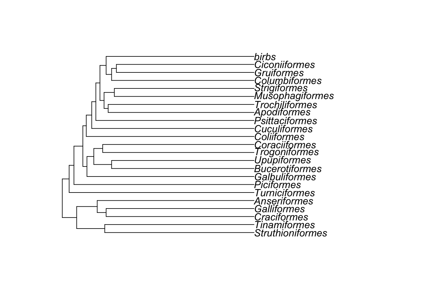 To run analyses in R we often need to manipulate our phylogeny in some way so that the analyses can work. I’ll mention these requirements where needed, but here are some common things we might need to change. I’ll use the bird.orders phylogeny again as it’s a manageable size.