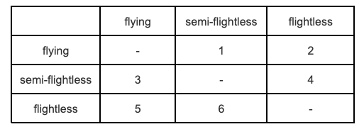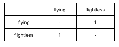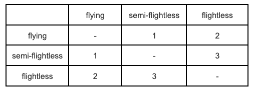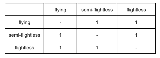 The \(Q\) matrix for our flying/semi-flightless/flightless example looks like this: