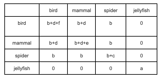 As already mentioned above, these root-to-tip values give us the variance of the trait across the tree. But what about the covariances among species, i.e. the shared branch lengths? We can extract these in the same way. The shared branch length between the robin and the deer is simply b + d (note that we don’t include e or f because these branches only lead to either the robin or the deer). The shared branch length between the robin and the spider is b, because this is the only branch that leads towards them both. Likewise, the shared branch length between the deer and the spider is also b. The slightly tricky one is what is the shared branch length between the robin/deer/spider and the jellyfish? They don’t share a branch at all in this phylogeny so we say their shared branch length is zero.