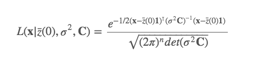 We know that under a Brownian motion model, the data at the tips and nodes are drawn from a multivariate normal distribution with a variance-covariance matrix, \(C\), that is calculated using the phylogeny (see Chapter 3). Therefore, we can calculate the likelihood of our data given the Brownian model (remember likelihood is proportional to the probability of observing the data given the model, P(data|model)) using a standard formula for the likelihood of drawing numbers from a multivariate normal distribution.